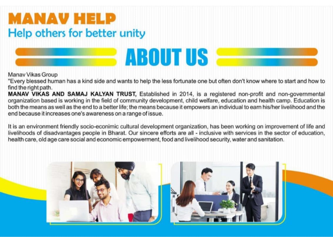 MANAV VIKAS AND SAMAJ KALYAN TRUST, Established in 2014, is a registered non-profit and non-governmental organization based is working in the field of community development, child welfare, education and health camp. Education is both the means as well as the end to a better life; the means because it empowers an individual to earn his/her livelihood and the end because it increases one's awareness on a range of issue.